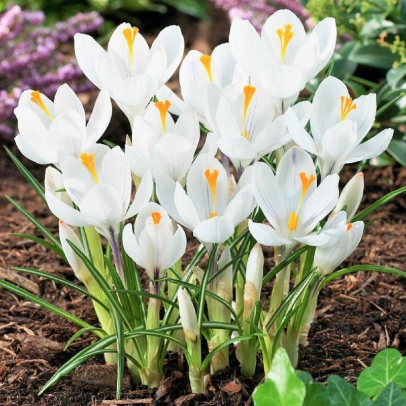 Крокус "Жанна Дарк" – это изысканный весенний цветок, который станет настоящим украшением вашего сада. Его крупные, белоснежные цветы с легким фиолетовым оттенком и ярко-желтыми тычинками создают неповторимый контраст и привлекают внимание. Луковицы этого сорта отличаются высокой устойчивостью к холодам и неприхотливостью в уходе, что делает их идеальным выбором для начинающих садоводов и опытных цветоводов.